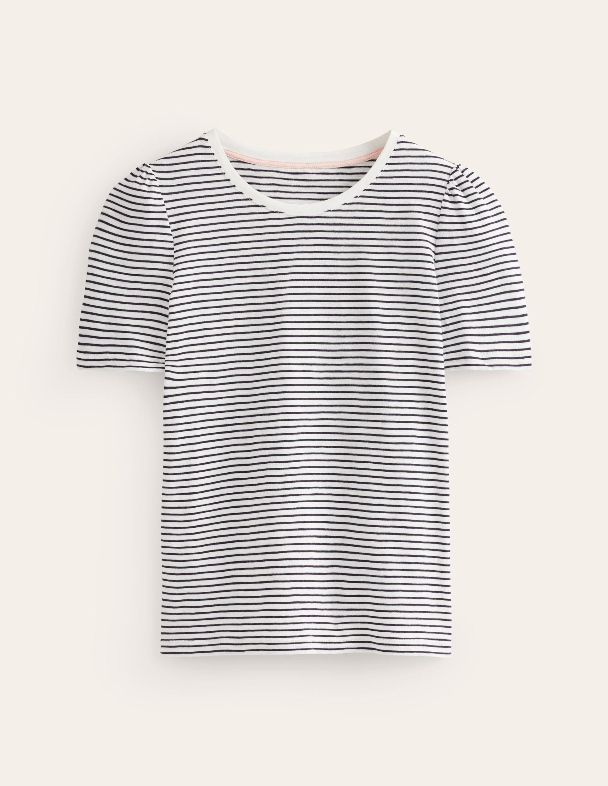 Cotton Puff Sleeve T-Shirt-Ivory, Navy Stripe