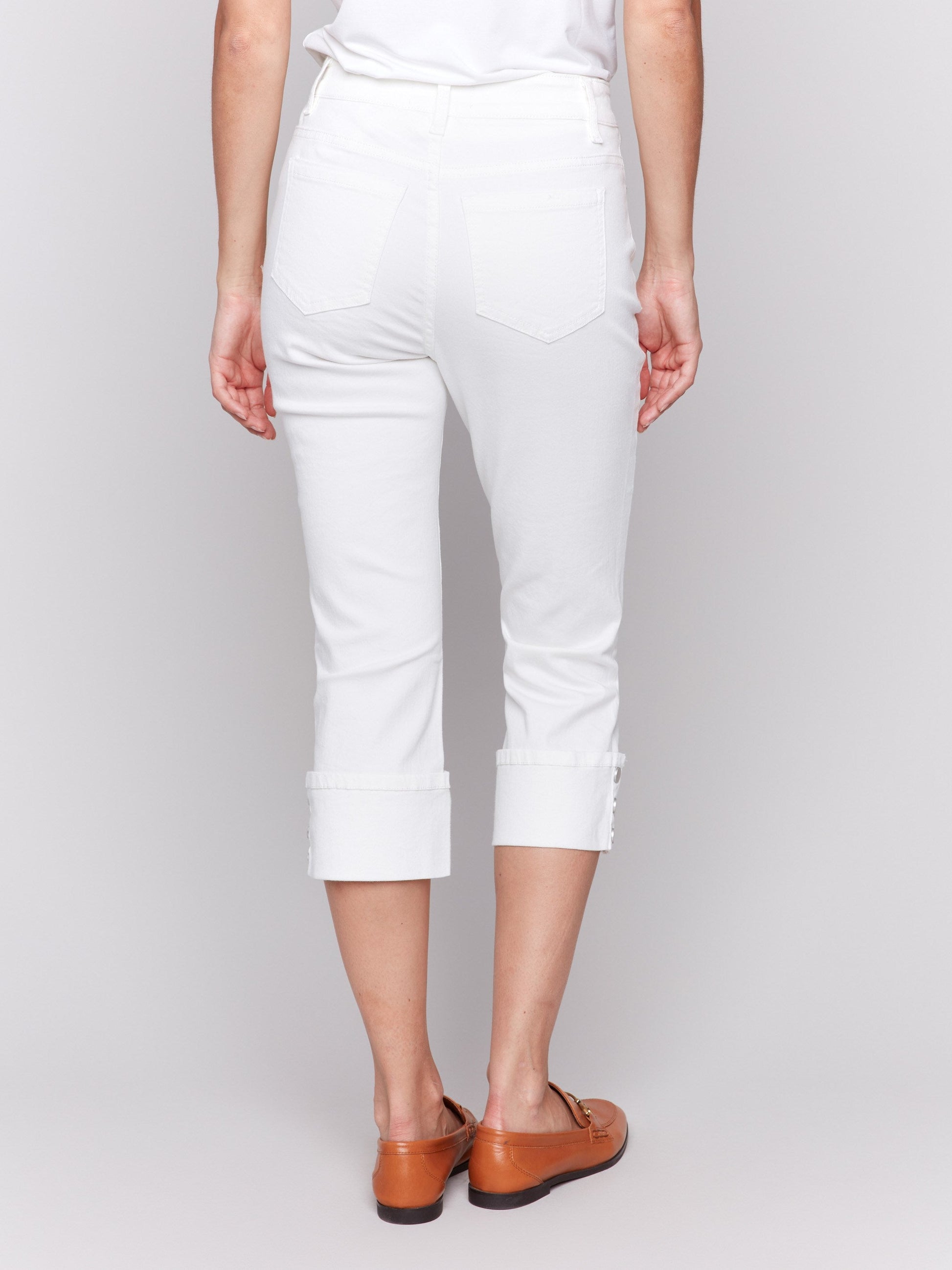 Cropped Twill Jeans with Snap Button Cuff Detail - White