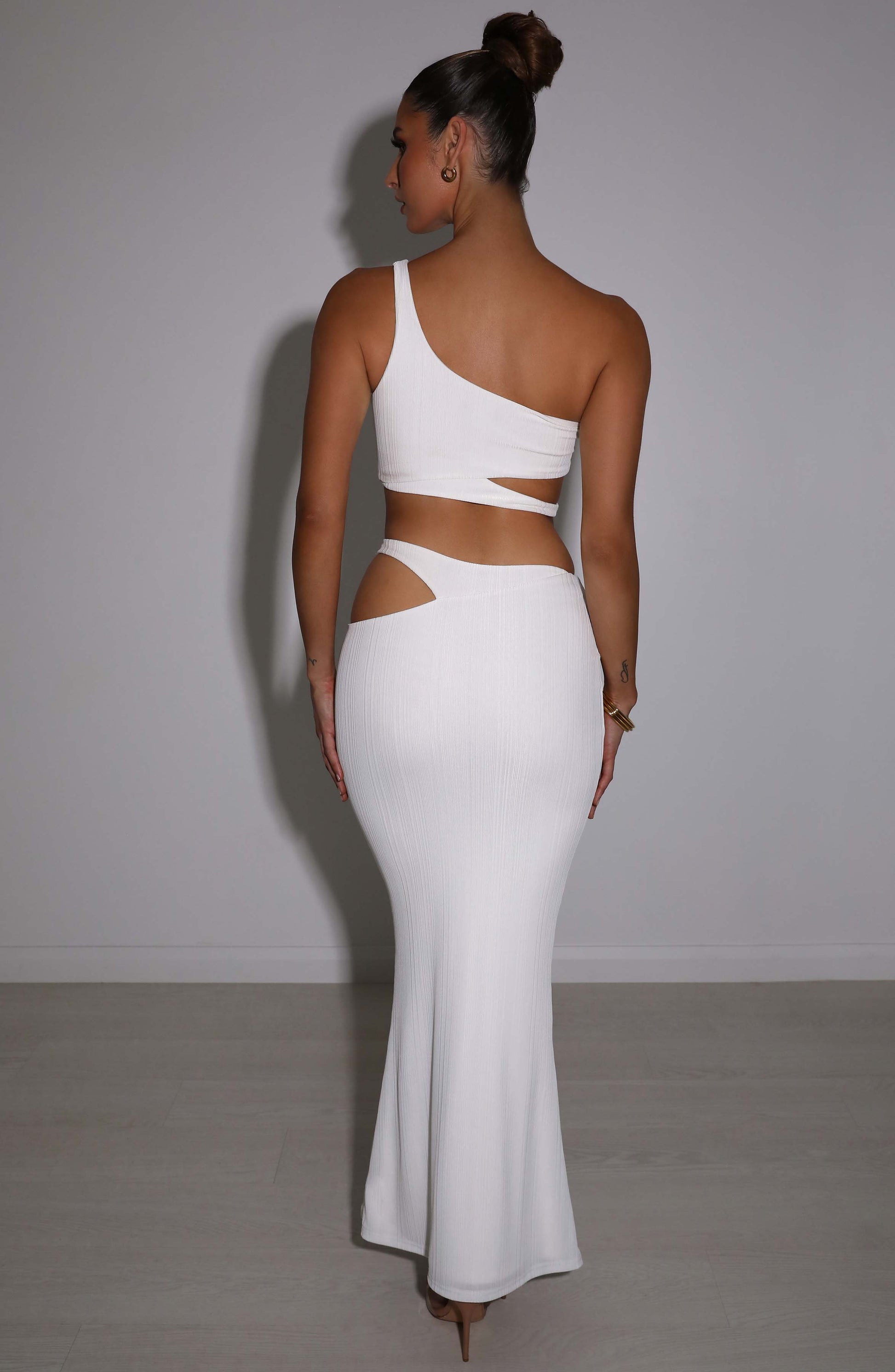 The cool. contemporary fit of Kaela is like no other. featuring an asymmetric. cut out detail waist. With a high waist design and floor sweeping maxi length. the Kaela skirt is made in our luxe textured rib that hugs curves. Style it up with minimal gold hoops. a sleek. high bun and the matching Kaela crop top.