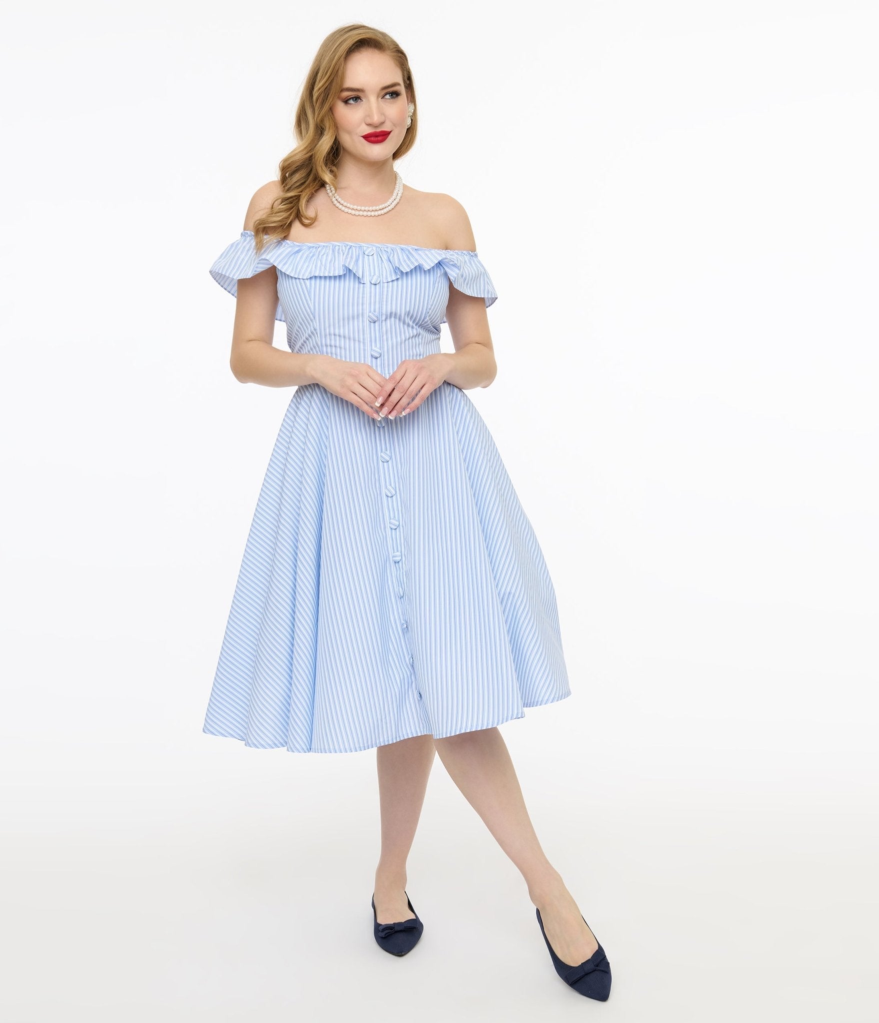 This delightful 1950s swing dress features playful blue and white stripes that dance gracefully as you twirl. The versatile design allows you to wear it off the shoulder for a flirty vibe. or keep it classic with elastic shoulders. With its flattering front button-down style. this dress adds just the right touch of retro flair while ensuring comfort all day long.