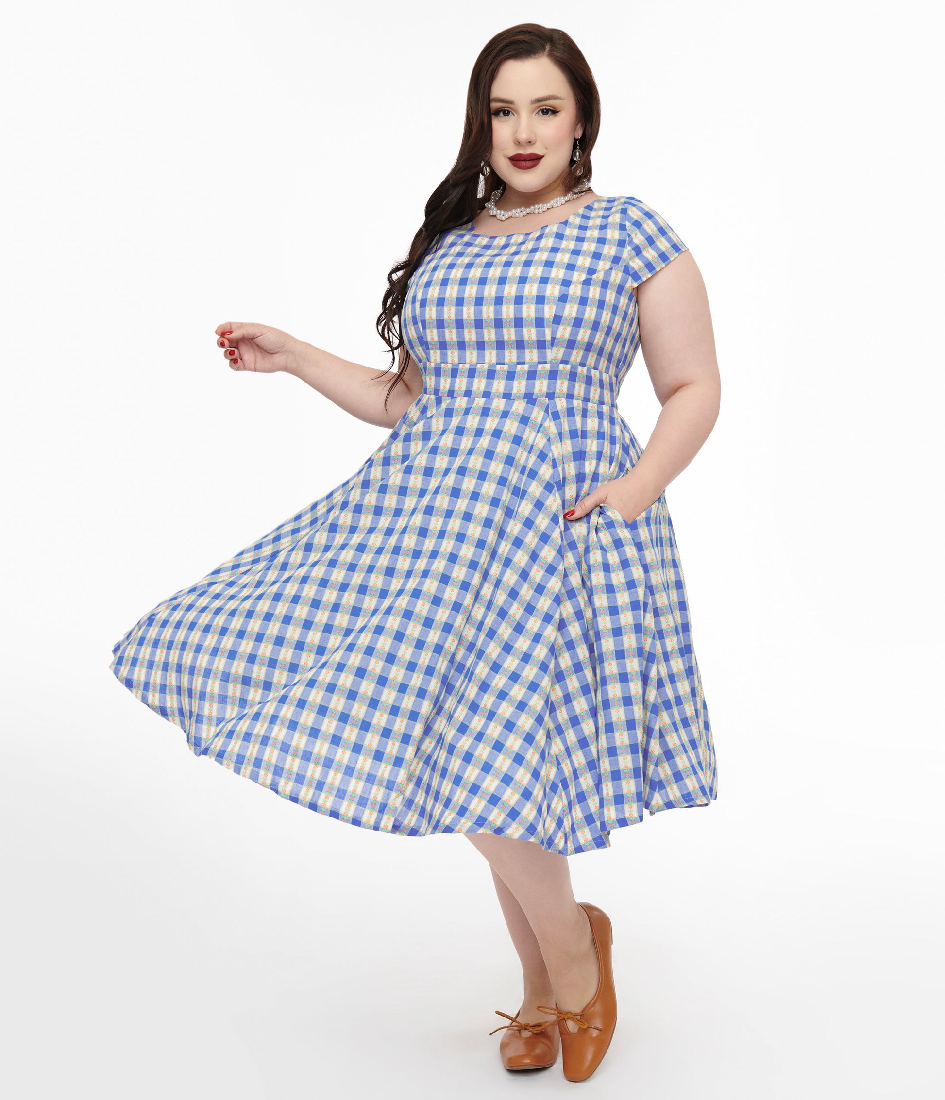 Magnolia Place Plus Size 1950s Blue Floral Gingham Anna Swing Dress