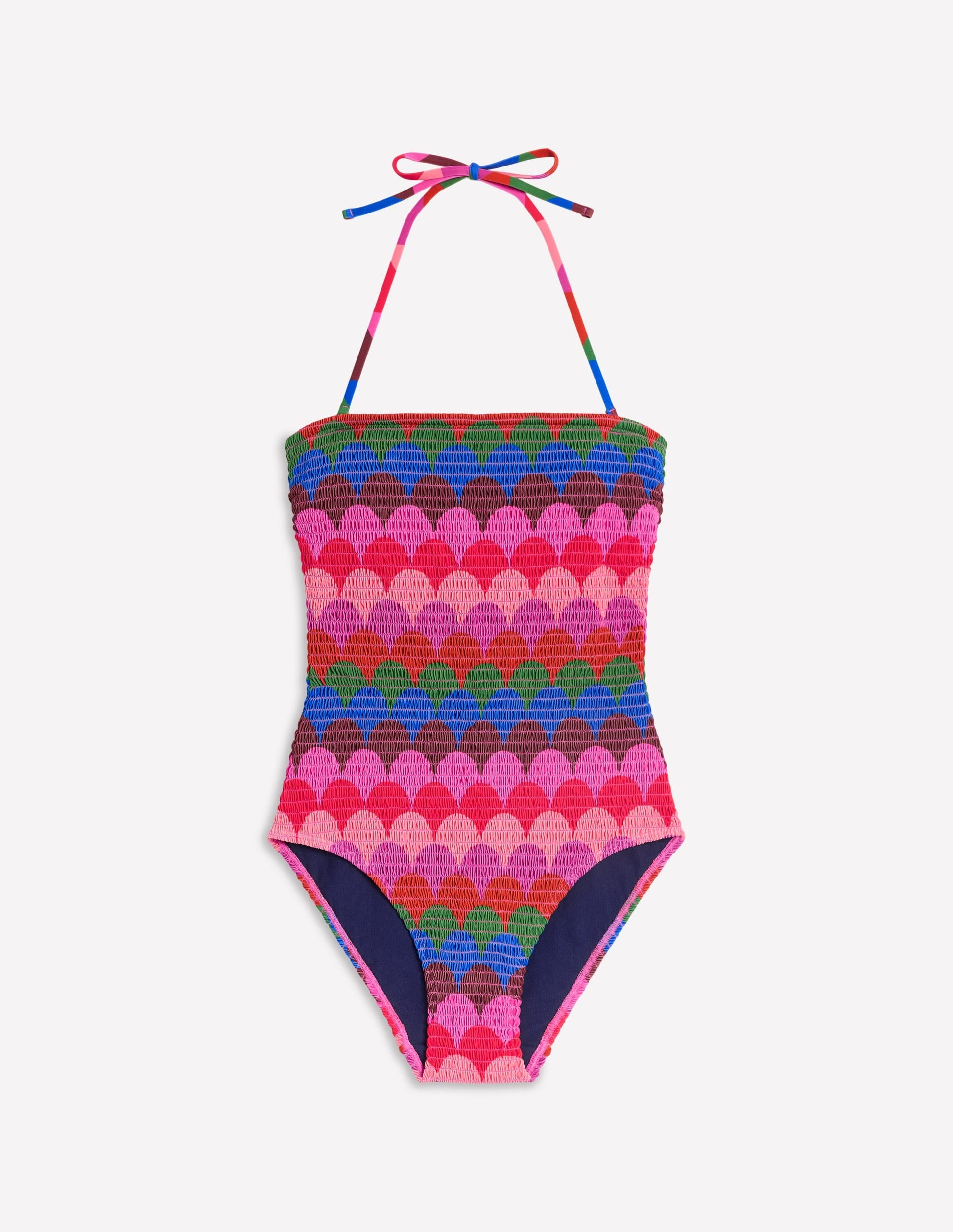 This classic bandeau swimsuit features all-over smocked detailing and a high-leg shape. The fixed cups and hidden silicone tape make for a comfortable. supportive fit. It has adjustable halter neck ties and comes in a variety of stand-out prints.