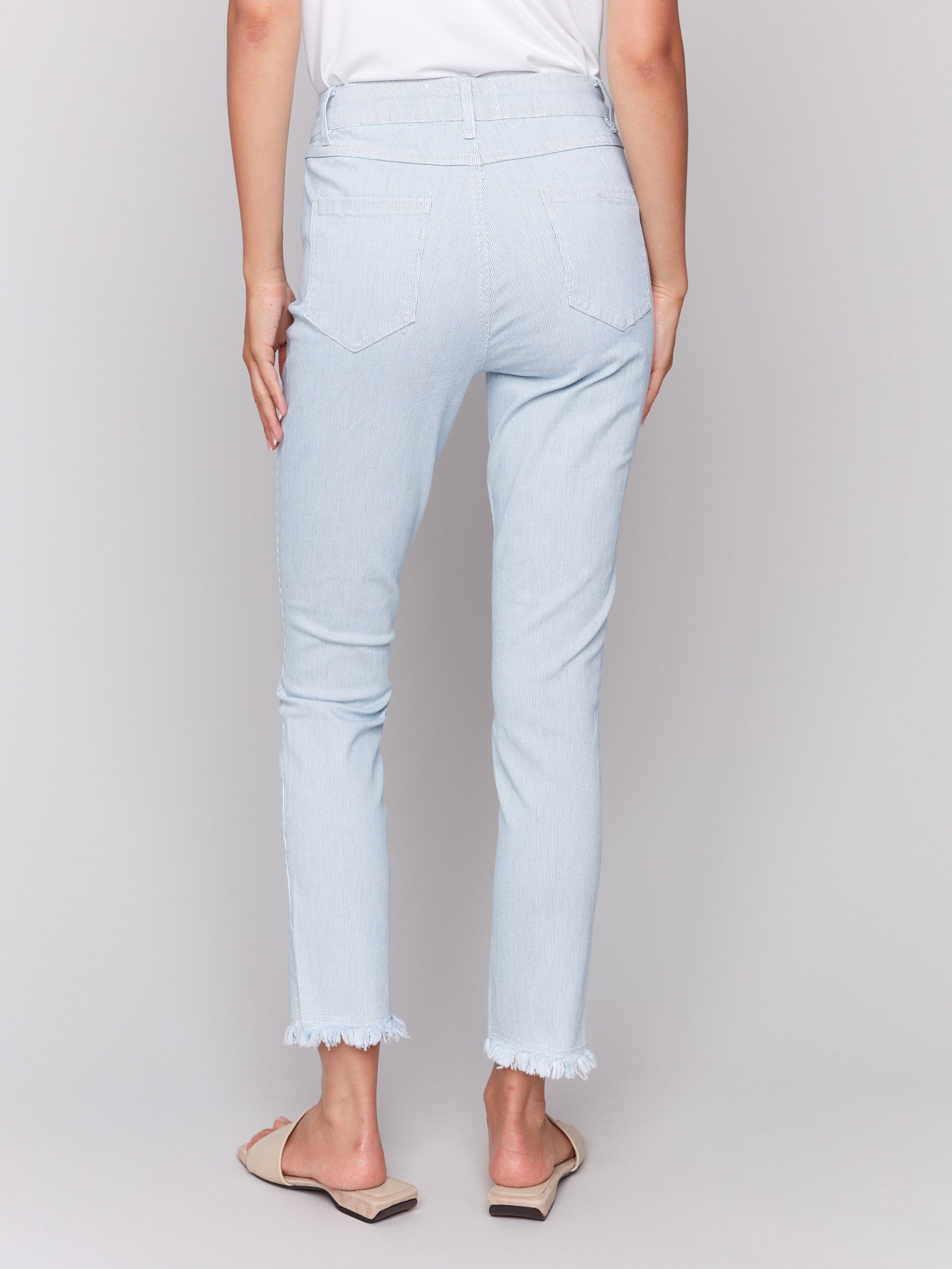 These twill pants offer an effortless blend of style and comfort. The regular rise and slim fit. accentuated by delicate light blue stripes. add a touch of elegance to your look. The stylish hem slit adds a unique detail. making these pants the perfect choice for casual outings or a day at the office.