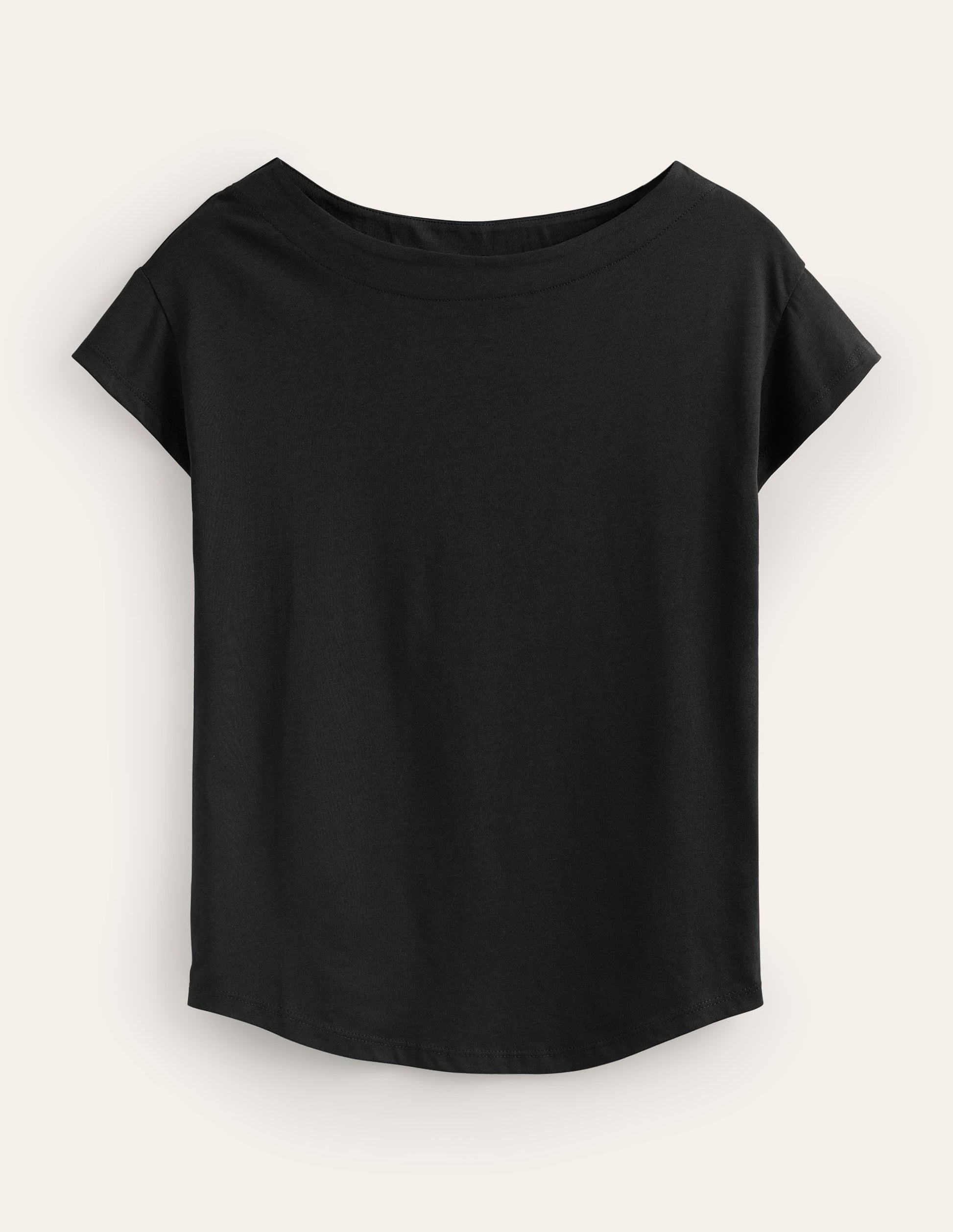 Playing with silhouette is an easy way to bring interest to everyday looks. This soft cotton-modal blend tee is cut for a slim fit with a flattering boat neck.