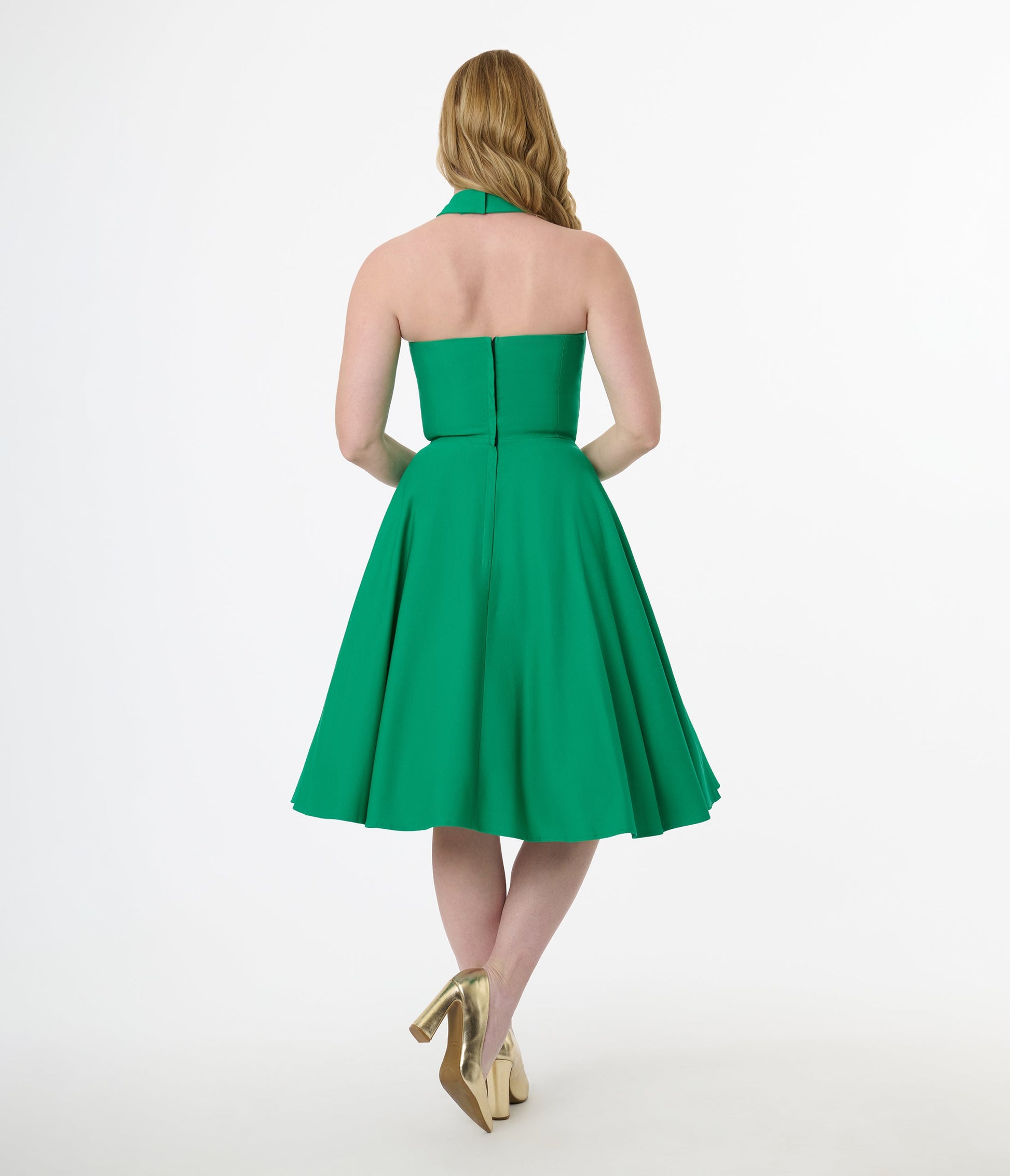 Unique Vintage 1950s Green Criss Cross Halter Rita Flare Dress