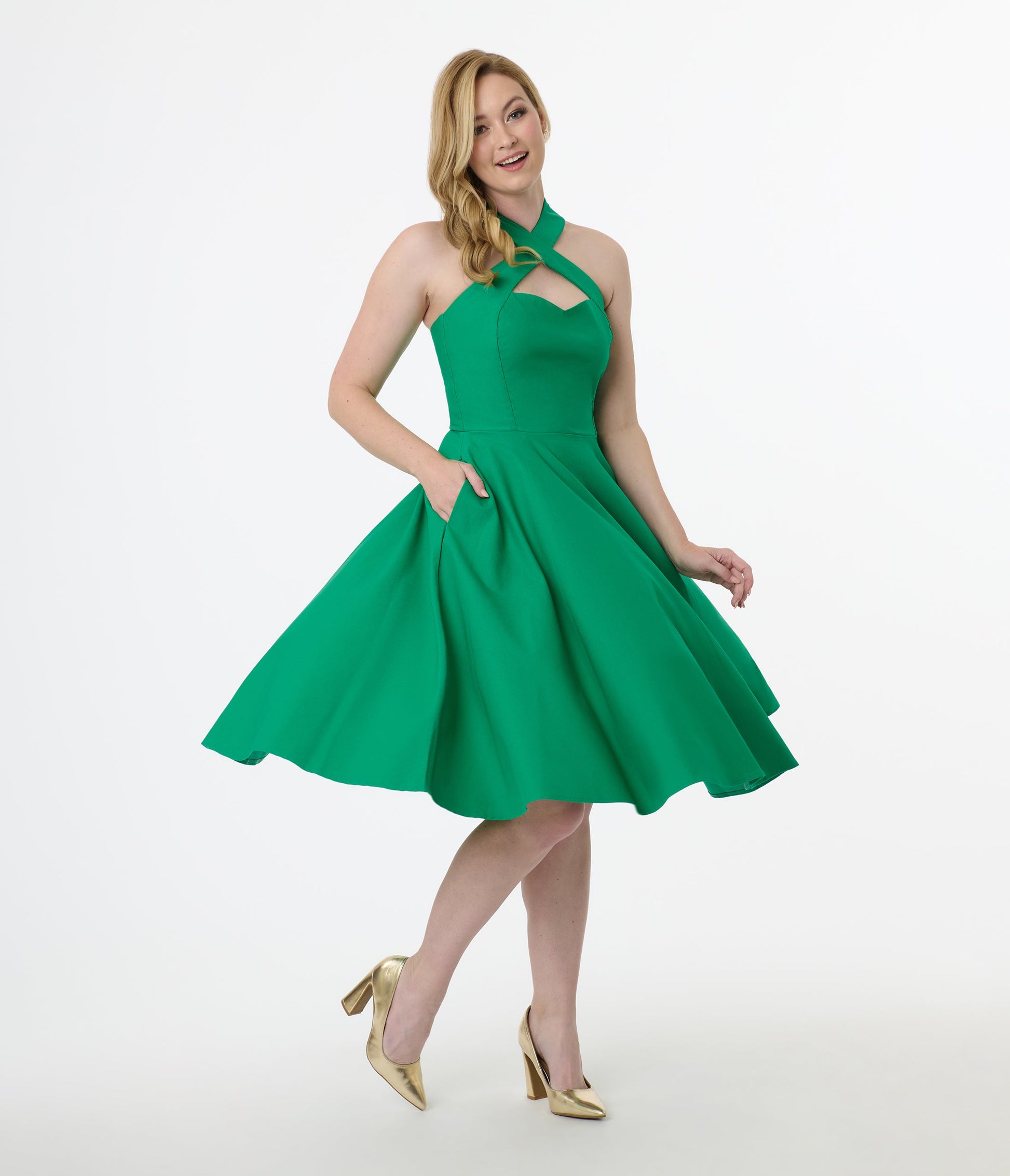 The Rita flare dress is a glamorous rockabilly go-to! This striking frock is crafted in a green bengaline stretch fabric. Outfitted with a criss cross halter neckline. side pockets. and a back zipper!