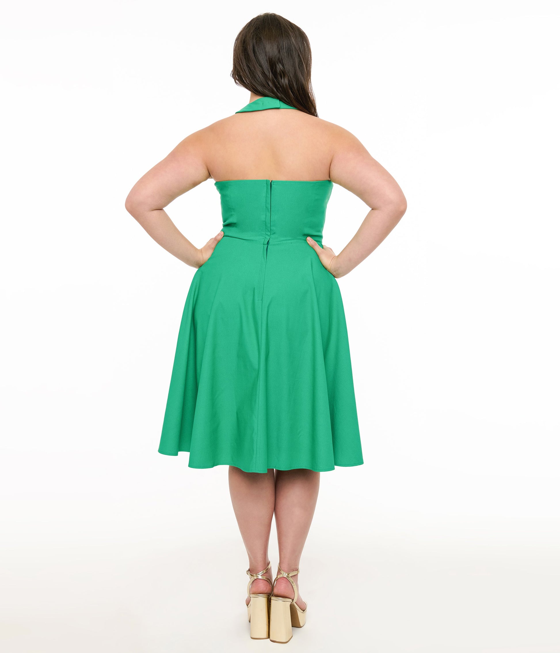 Unique Vintage Plus Size 1950s Green Criss Cross Halter Rita Flare Dress